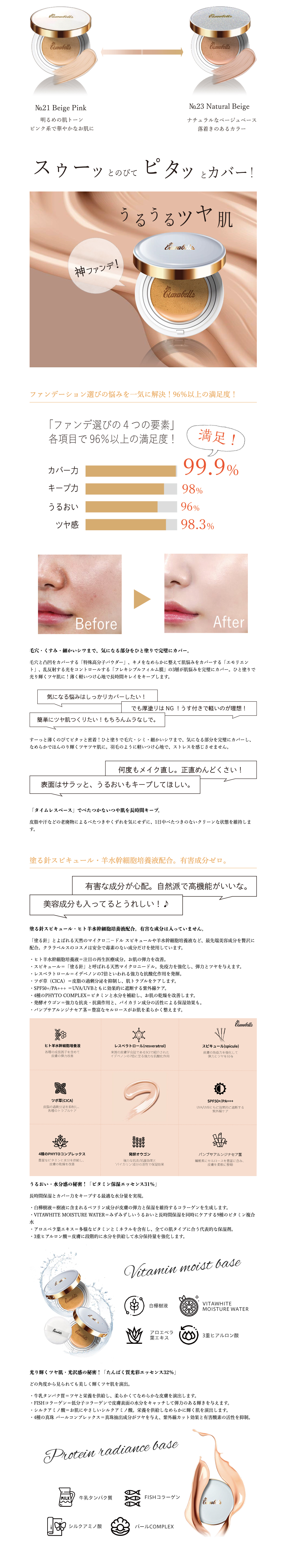 薄付きで羽毛のように軽いつけ心地なのに、肌悩みを完璧にカバー。塗った瞬間ツヤ肌に。うるおってべたつかずキレイをキープ。塗る針スピキュール・羊水幹細胞培養液など、最先端美容成分配合でメイク中もスキンケア。一度使ったら手放せない「神ファンデ」 デビュー!