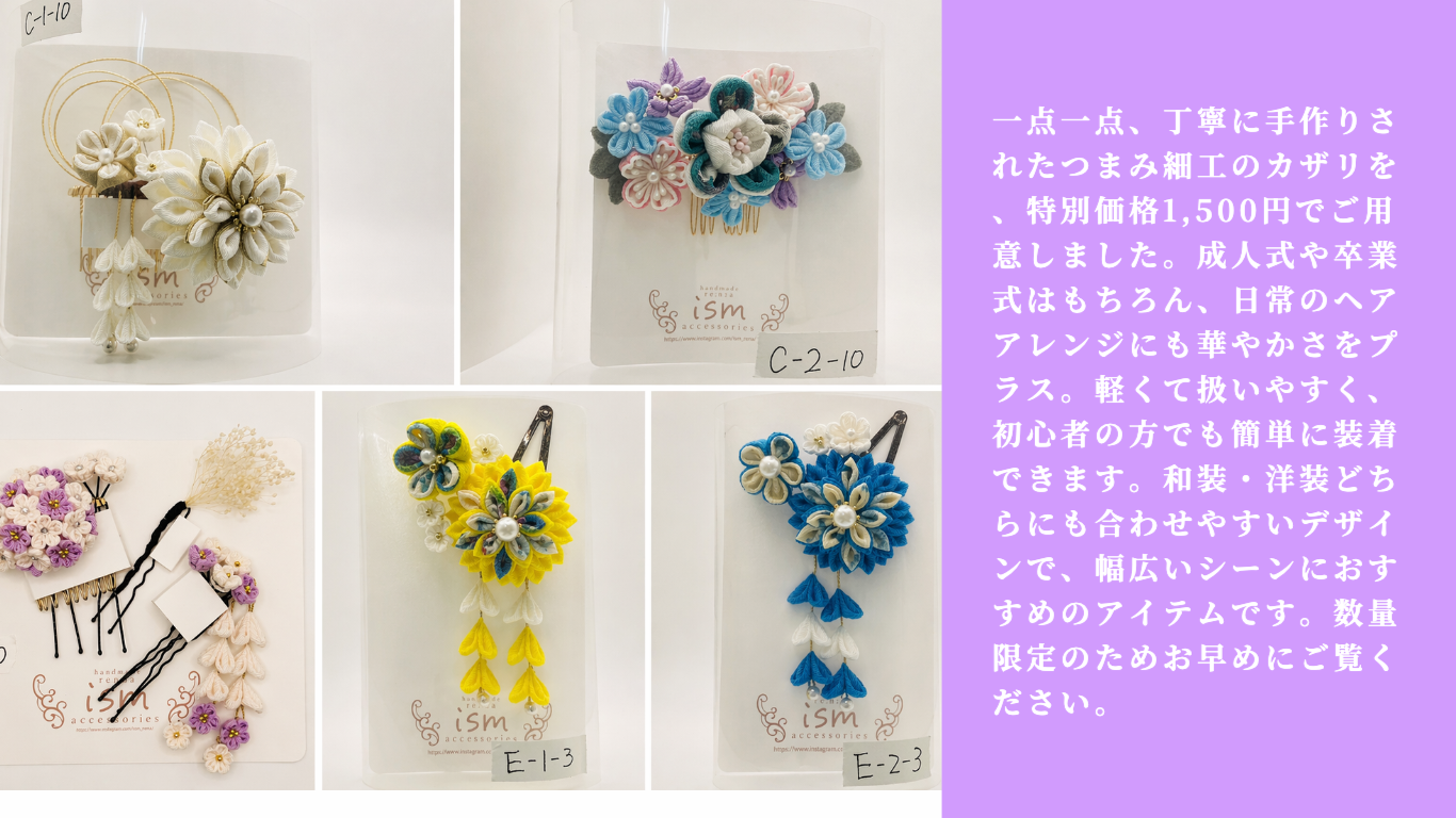 一点一点、丁寧に手作りされたつまみ細工のカザリを、特別価格1,500円でご用意しました。成人式や卒業式はもちろん、日常のヘアアレンジにも華やかさをプラス。軽くて扱いやすく、初心者の方でも簡単に装着できます。和装・洋装どちらにも合わせやすいデザインで、幅広いシーンにおすすめのアイテムです。数量限定のためお早めにご覧ください。