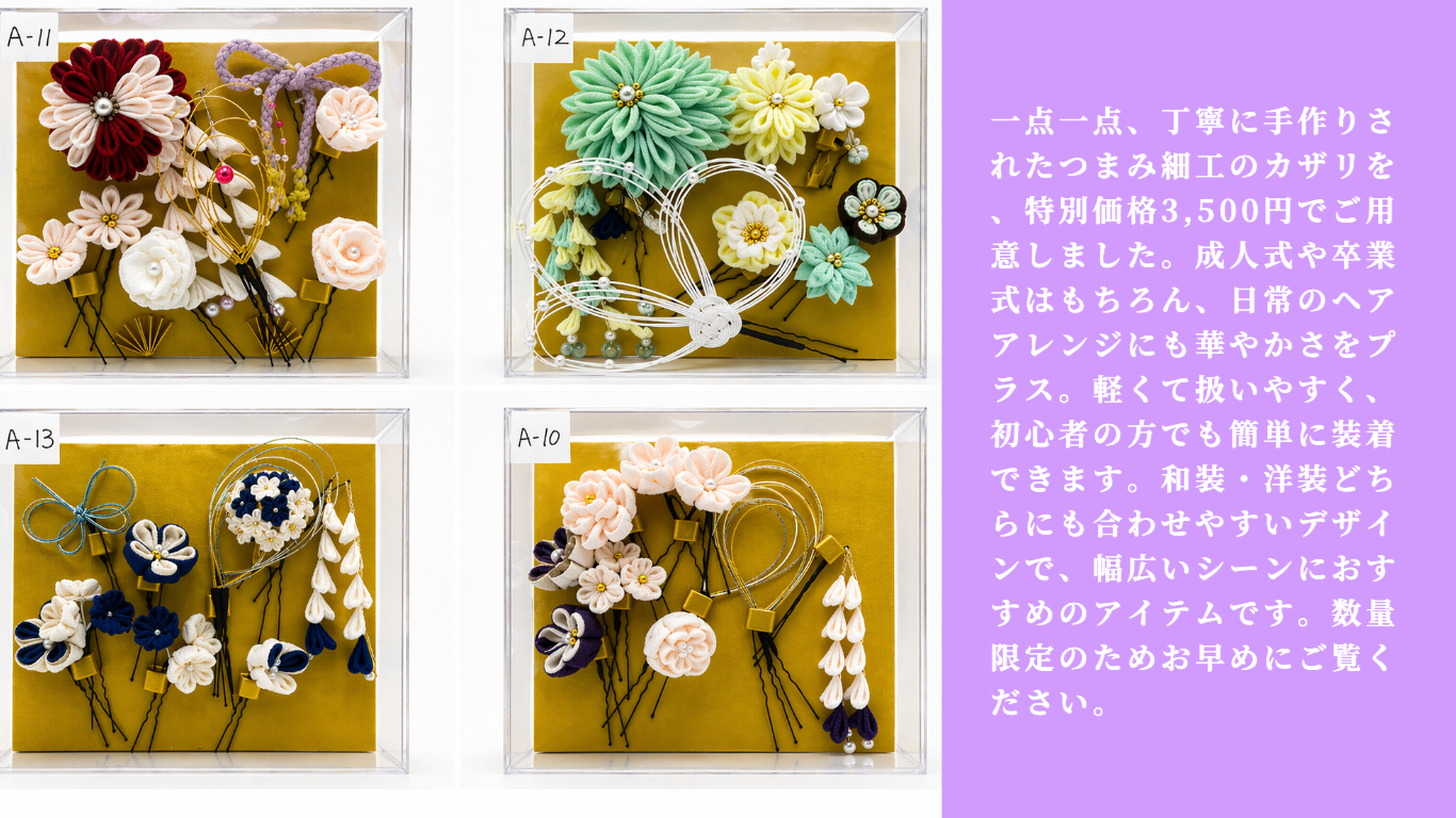 一点一点、丁寧に手作りされたつまみ細工のカザリを、特別価格3,500円でご用意しました。成人式や卒業式はもちろん、日常のヘアアレンジにも華やかさをプラス。軽くて扱いやすく、初心者の方でも簡単に装着できます。和装・洋装どちらにも合わせやすいデザインで、幅広いシーンにおすすめのアイテムです。数量限定のためお早めにご覧ください。